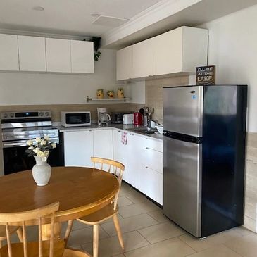 Coffee maker, Dishwasher, Microwave Oven, Stove, Toaster, Dishes and cutlery, Refrigerator